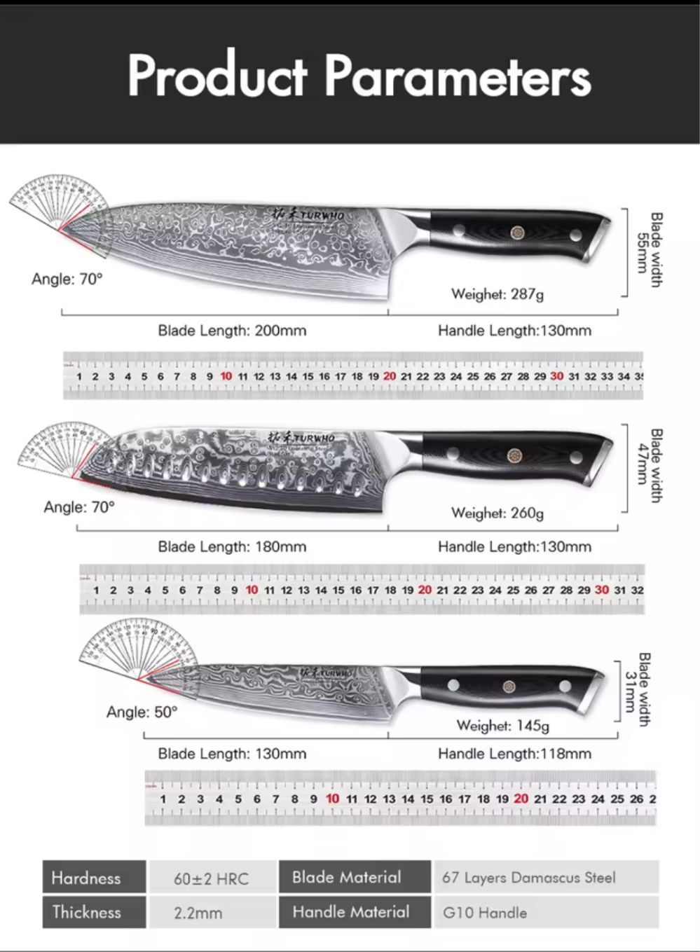 Chaque lame est fabriquée en acier damas de 67 couches avec une dureté de 60 ± 2 HRC. Le manche en bois de haute qualité avec un motif en résine est non seulement élégant, mais il offre également une prise en main parfaite et durable.