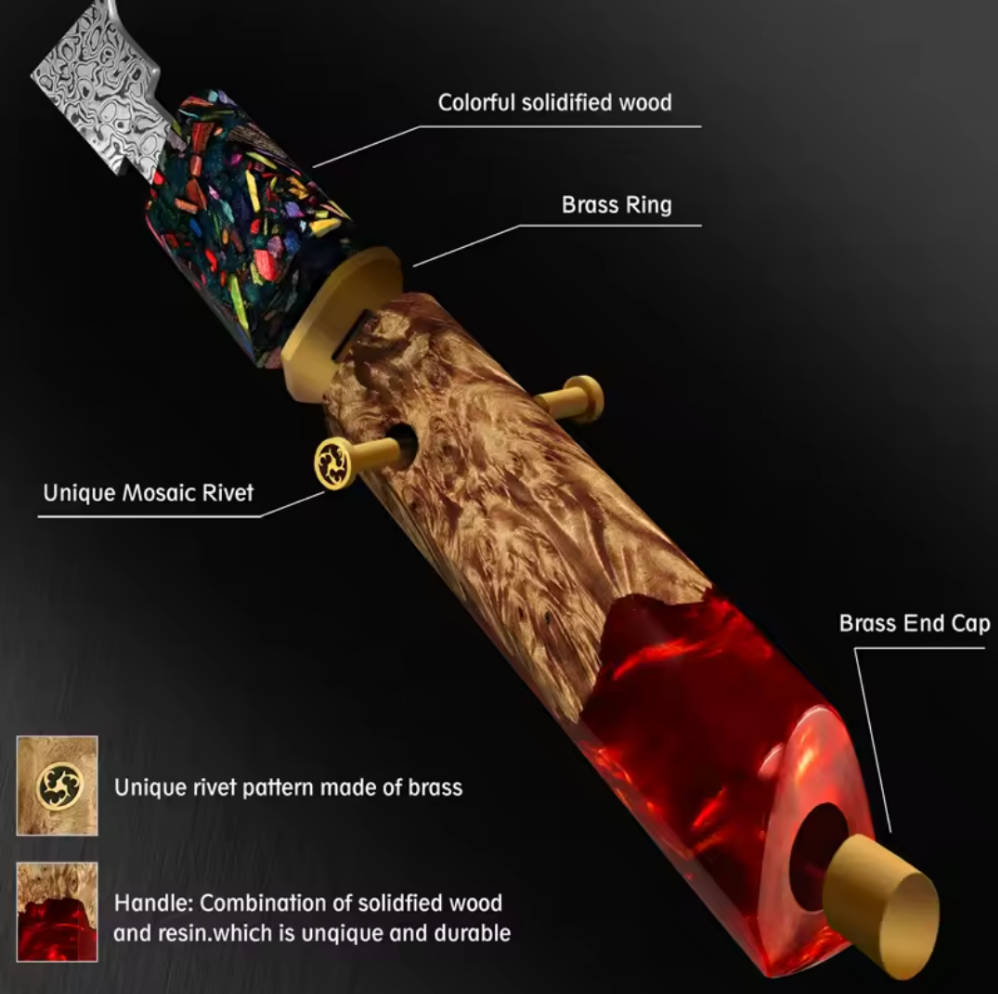 Le manche, en bois stabilisé et résine colorée, procure une prise en main parfaite et ajoute une touche d'élégance à votre cuisine. C'est l'outil idéal pour tous les passionnés de cuisine, qu'ils soient débutants ou experts.